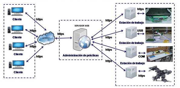 El servidor de aplicaciones Web es el encargado de la comunicación entre los clientes Web y las estaciones de trabajo; desde este se realiza la administración de las prácticas y es gestionado el flujo de trabajo propuesto. El servidor de aplicaciones Web permite el intercambio de información mediante servicios Web con las estaciones de trabajo. Las estaciones de trabajo se conectan físicamente con las plantas que funcionan como maqueta en el sistema.