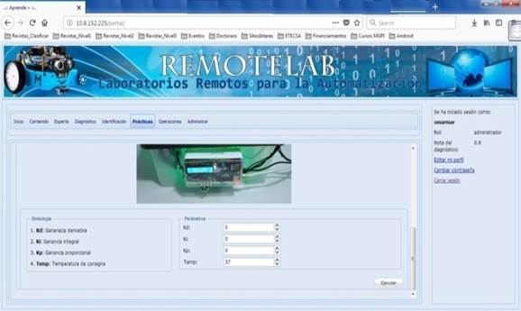 A partir de la obtención de los parámetros del controlador, se procedió a ejecutar las prácticas reales. La ejecución de las prácticas reales permite, a partir de la sintonía de los parámetros del controlador, ejecutar la práctica en el dispositivo físico. Para ello se determina la estabilidad del controlador propuesto previamente. La Figura 9 muestra la interface utilizada para la ejecución de las prácticas reales.