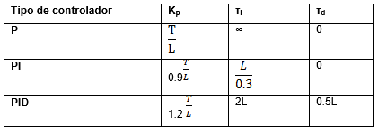 A partir de las reglas del diseño se decide si el controlador es P, PI o PID para que el tipo del sistema sea uno. Por Ziegler-Nichols los parámetros del controlador se calculan tal como expresa la Tabla 1(Ziegler and Nichols, 1942).