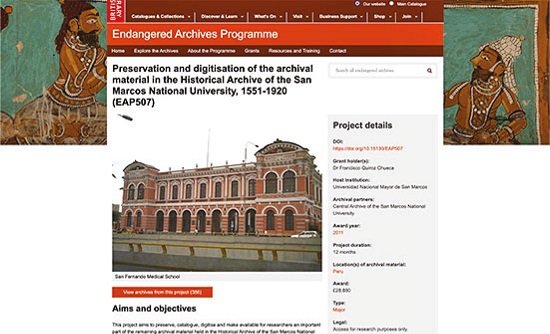 Endangered Archives Programme (s.d.) facilita la digitalización de archivos en todo el mundo que están en peligro de destrucción, abandono o deterioro físico. Desde 2004, el programa ha digitalizado más de ocho millones de imágenes y 25 mil pistas de sonido. Los tipos de archivos digitalizados hasta ahora incluyen fuentes impresas raras, manuscritos, materiales visuales, grabaciones de audio, entre otros. Para aquellos interesados en temas de historia de salud en Perú, destacamos el proyecto de digitalización del material de la Facultad de Medicina de la Universidad Nacional Mayor de San Marcos que permite acceder a decenas de tesis de medicina, especialmente del siglo XIX (Preservation…, 2011). Para aquellos interesados en revisar prensa, el programa ha puesto a disposición el periódicoEl Deber de Arequipa (Preserving…, 2014) y otros periódicos regionales de las ciudades de Lambayeque, Ayacucho, Tacna, Cajamarca y Huancavelica (Recovering…, 2011).