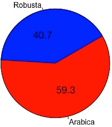 De la producción mundial de café reportada por la OIC entre las cosechas 2013/14 y 2014/15, el 59.3% correspondió a la especie arábica y 40.7% a los robusta (Figura 3).