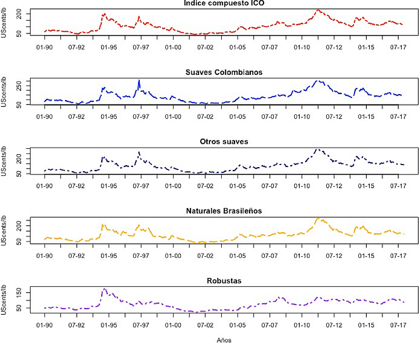 La dinámica de la oferta y demanda, así como el comercio internacional de café hasta 1989 era controlada mediante una serie de Acuerdos Internacionales de café, cuyo objetivo era el de mantener precios estables y administrar la oferta de dicho bien. A partir de 1990 el mercado de café ha estado sujeto a un mercado libre de oferta y demanda. En el período que este mercado libre ha estado vigente se han presentado dos periodos de precios bajos (1989-1993 y 1999-2004), siendo el de 1999-2004 conocido como la crisis del café (ICC, 2014). De acuerdo con récords históricos de precios posteriores al fin de esta crisis (2004), éstos han mejorado en relación con los precios durante las dos crisis antes mencionadas, pero la ICC reporta alta variabilidad en los precios debido al incremento de costos de los insumos para la producción de café.