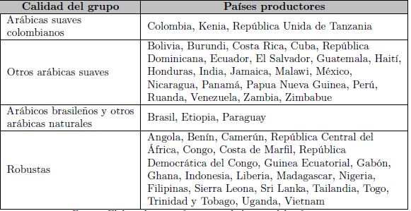 Por distintas razones, la OIC ha clasificado la producción en cuatro grupos con base al tipo predominante de café producido en cada país miembro, aunque en general se producen los dos tipos: arábica y robusta, pero también se puede apreciar el número de países productores según el grupo de calidad en el Cuadro 1.
