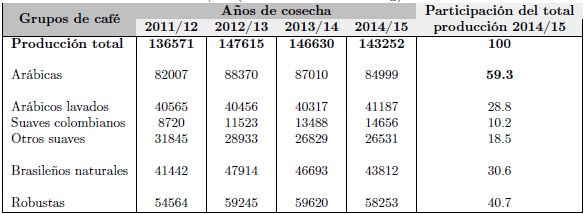 “Para la cosecha 2014/15, la producción mundial de ambas especies disminuyó en 2.3% respecto a la cosecha anterior, mientras que en términos absolutos la disminución en la producción de arábica y robusta fue de 2 y 1.3 millones de sacos, respectivamente” (Instituto del Café de Costa Rica, 2015, p. 10).