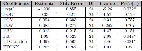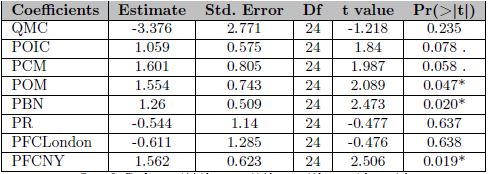 Posteriormente, al realizar la regresión por componentes principales usando el número óptimo de componentes, se obtuvieron los coeficientes de las variables originales (Cuadro 3), donde resultaron significativos (al nivel ∝=0.05) las exportaciones, los precios de Robustas y los precios futuros de Londres. En el primer paso, se tuvo que establecer que aproximadamente el 90.0% de la producción mundial de café se llevaba a cabo en países en desarrollo, mientras que el consumo se concentraba principalmente en economías desarrolladas (Ponte, 2002).
