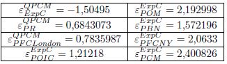 De acuerdo con los valores del Cuadro 5, la elasticidad de la cantidad producida de café a nivel mundial con respecto a las exportaciones indicó que si se incrementaran éstas en un 10% la producción disminuiría un 15.05%. Para el caso del precio de café robusta (PR) y de precios futuros de la bolsa de Londres (PFCLondon), al aumentar en 10% cada uno de ellos tendría como consecuencia que la cantidad producida aumentara en 6.84 y 7.83% respectivamente, es decir, que la cantidad producida de café resultó elástica a las exportaciones (ExpC), e inelástica para los precios de robusta y los precios futuros de la bolsa de Londres. En cambio, las exportaciones de café se mostraron elásticas con respecto al precio de café otros suaves (POM), al precio de café de naturales brasileño, al precio futuro promedio mensual al cierre del período de estudio para la bolsa de Nueva York, al precio de café suaves colombianos y el precio indicativo de la OIC; es decir, que si aumentaran en 10% cada uno de los precios anteriores, las exportaciones de café a nivel mundial, se incrementarán en 21.9, 15.7, 20.6, 24.0 y 12.1%, respectivamente.