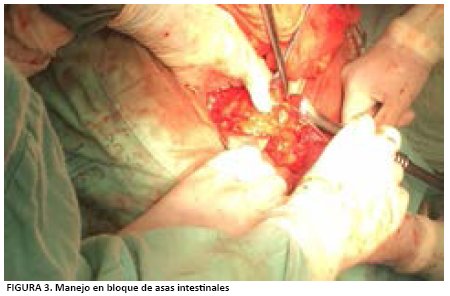 Se ingresa a procedimiento quirúrgico evidenciando cicatriz cutánea retráctil irregular, anillo herniario de más o menos 20 cm x 15 cm, saco herniario que contiene asas de intestino delgado, retracción aponeurótica de aproximadamente 15 cm. Múltiples adherencias inter asas y apelotonamiento de intestino delgado con adherencias a pared abdominal anterior (abdomen congelado), (ver figura 3).