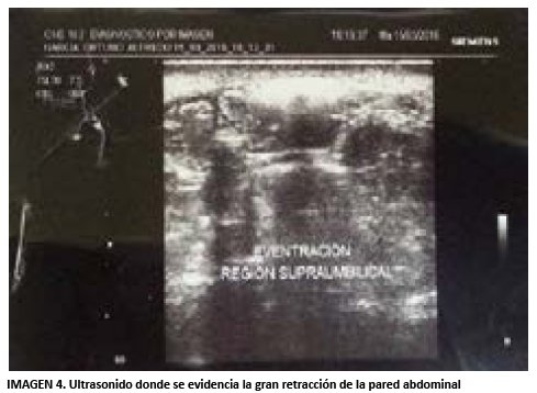 Basados en los antecedentes se realiza un estudio de colon por enema, evidenciándose el paso libre de contraste hasta colon transverso, además de tomografía axial computarizada que muestra diátesis de rectos supra e infraumbilical, distancia de defecto de pared muscular 25 cm, hernia insicional gigante. Ecografía de pared reporta región supraumbilical izquierda, asas intestinales separadas de la piel por delgada capa de tejido celular subcutáneo compatible con una eventración (ver figura 2).