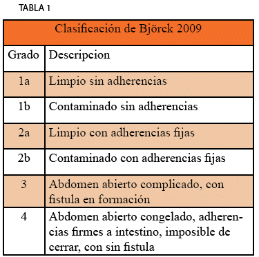 La clasificación de Björck del abdomen abierto es una estrategia para determinar el grado de adherencias en la cavidad abdominal y posicionar su complejidad en cuatro grados desde escenarios simples hasta los más complejos para prevenir mayor deterioro y realizar acciones oportunas para su manejo 13,14 (ver tabla 1); comparando las características descritas en el caso, se posiciona dentro de un grado 4 de Björck el cual describe un abdomen abierto congelado con adherencias firmes a intestino, imposible de cerrar sugiriéndose como conducta el devolver la fisiología y la nutrición del paciente a la normalidad, proteger la piel y la fascia, previniendo la sepsis y posponiendo la reconstrucción compleja, generalmente entre 6 y 12 meses14.