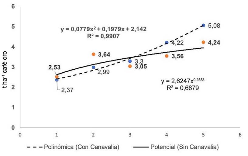 Para el rendimiento acumulado se encontró un mayor ajuste a la función cuadrática (y= 0,0779 N2 + 0,1979 N + 2,142) en el caso de los tratamientos con canavalia y a una función exponencial (y = 2,6247 N 0,2558) en el caso de los tratamientos sin la misma (Figura 1). Se observó que para los niveles productivos acumulados hasta 3 t ha-1 de café oro (promedio anual de 1 t de café oro) fue suficiente el sistema de fertilización mineral N2. Niveles productivos superiores necesitan de un suministro adicional de nitrógeno, que en este caso se logró con la incorporación de la canavalia con la aplicación del sistema de fertilización N4.