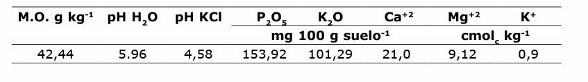 El suelo es un Cambisol eutrico (World Reference Base for Soil Resources, 2014) y se caracterizó por una fertilidad adecuada para el cultivo, con valores altos de acidez, contenidos altos de materia orgánica, de fósforo y potasio asimilable producto de las fertilizaciones recibidas, predominio del calcio en el complejo de absorción y contenidos altos de potasio intercambiable (Cuadro 1). El porcentaje de este último catión con respecto a la suma de bases es alto y muestra una situación de equilibrio y una relación Ca / Mg dentro del rango adecuado para el cultivo. El pH es ligeramente superior al rango óptimo planteado para el cultivo en Centroamérica entre 5,0 y 5,5 (Carvajal, 1984), sin embargo, en años con un buen régimen de precipitación (2000 mm), se ha logrado obtener rendimientos promedio satisfactorios de 2 t ha-1 de café oro en un ciclo productivo (Bustamante et al., 2015), que disminuyeron a 1,3 t ha-1 café oro cuando las precipitaciones fueron del orden de 1400 a 1600 mm año-1, lo que indica que no fueron las características edáficas la principal causa de los bajos rendimientos.