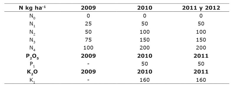 Los sistemas de fertilización mineral empleados (Cuadro 2) consideraron los altos contenidos de fósforo y potasio disponible en el suelo al finalizar el segundo ciclo productivo del cultivo y, por tanto, se aplicaron cantidades inferiores a las recomendadas por el Instructivo Técnico que son de 50 y 300 kg ha-1 año-1 de P2O5 y K2O, respectivamente, para este tipo de suelo (Díaz et al., 2013).