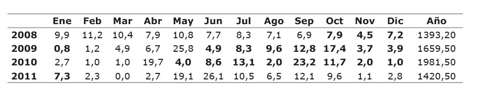 Las precipitaciones en Cuba se dividen en dos épocas, el periodo lluvioso de mayo a octubre y el poco lluvioso los meses restantes. Los datos de precipitaciones mensuales y anuales en el periodo experimental en la localidad se presentan en el Cuadro 3. En los cuatro años se encontró un año lluvioso (2010), el 2009 con una precipitación superior al acumulado histórico y dos años con precipitaciones inferiores a la media (86 a 88 %); de forma general, en el periodo lluvioso cae cerca del 70 % de la precipitación anual.