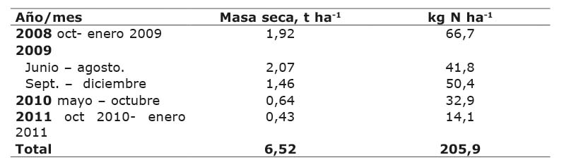 Table 4. Biomass and nitrogen input by C. ensiformis L. Instituto de Investigaciones Agro-Forestales, Tercer Frente Agro-Forestry Experimental Station, 2008 – 2011.