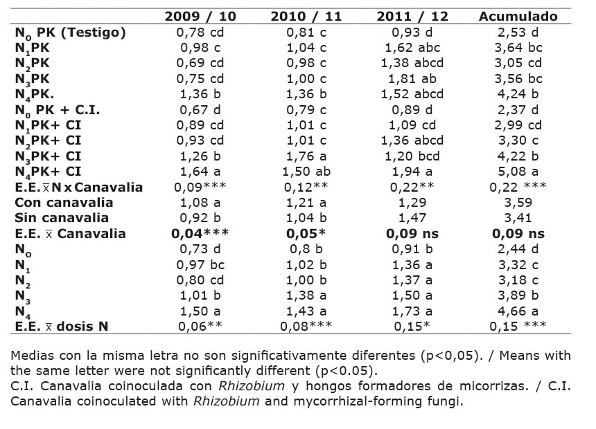 El efecto significativo de la canavalia inoculada sobre el rendimiento desapareció en la tercera cosecha, lo cual está en correspondencia con la menor producción de biomasa, aquí puede estar presente además el efecto negativo de las altas disponibilidades de fósforo en el suelo sobre el funcionamiento micorrízico que pudieron limitar uno de los beneficios esperados del intercalamiento de la canavalia inoculada.