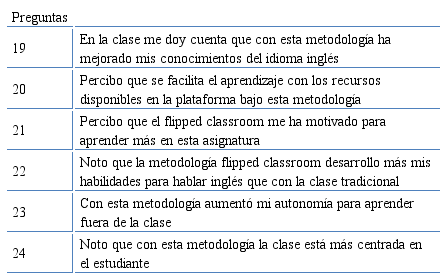 La variable del estudio correspondió a la percepción acerca del impacto que tiene la metodología flipped classroom sobre la naturaleza y condiciones del aprendizaje del idioma antes y durante la clase. Conforme a lo anterior, se diseñó y validó un cuestionario, por medio de Juicio de Expertos en educación, para explorar la percepción en las siguientes dimensiones: el aprendizaje antes de la clase, aprendizaje en el aula y la valoración de la metodología.