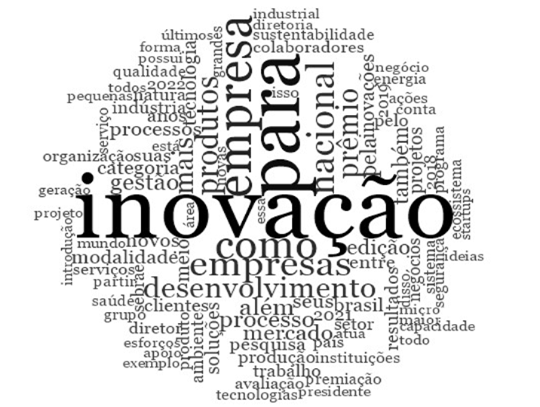 Primeiramente buscou-se identificar quais são os principais termos encontrados nos relatórios do Prêmio Nacional de Inovação. Essa análise é elementar como tarefa inicial no que tange a uma análise exploratória de conteúdo, pois seu principal objetivo é encontrar possíveis elos de ligação entre as práticas inovadoras das empresas premiadas com as características da inovação frugal (nós), isto é, pontos que podem destacar convergência entre a teoria (inovação frugal) e a práxis das empresas (Gibbs, 2007).