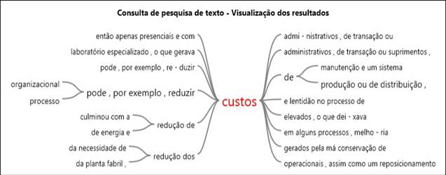 Buscando o aprofundamento do estudo e o entendimento sobre como são aplicadas estas práticas no dia a dia das empresas, apresenta-se a árvore das palavras (Fig. 3) custos e sustentabilidade, que são as duas práticas mais presentes nas ações das empresas premiadas nacionalmente por suas inovações. Ao analisar a árvore criada com a palavra custos, identifica-se a forte presença do termo redução (redução de, redução dos, reduzir), o que representa a constante preocupação das empresas em buscar soluções inovadoras para a redução de custos.