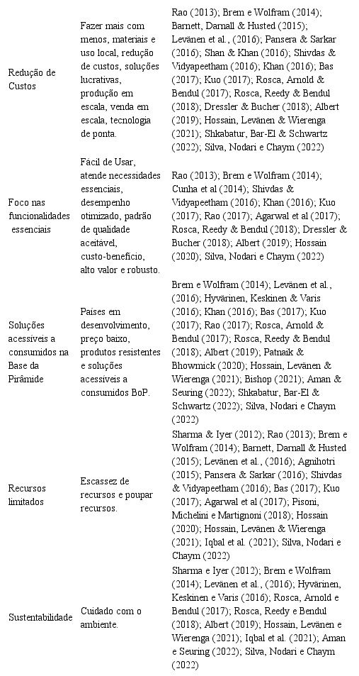 Albert (2019) categorizou nove atributos: funcionais e focados no essencial, custo inicial ou preço de compra significativamente menor, redução dos custos de propriedade, minimização do uso de recursos materiais e financeiros, amigável e fácil de usar, robusto, alto valor e qualidade, escalável com grandes números de vendas, e sustentáveis. Neumann, Winterwalter e Gassmann (2020) identificaram atributos como custos de produção reduzidos, funcionalidade voltada para o mercado consumidor, otimização e adaptabilidade do desempenho do produto com tecnologia simples a preços acessíveis. Singh, Seniaray e Saxena (2020) encontraram sete elementos-chave da inovação frugal: funcionalidade, usabilidade, desempenho, preço acessível, estética e robustez. Iqbal et al. (2021), destacam a acessibilidade, simplicidade, qualidade, resiliência, sustentabilidade, e suporte de gestão.