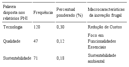 Os resultados mostram termos bem evidentes, que apresentam conversões temáticas relevantes, tais como: sustentabilidade, qualidade e tecnologia, termos esses que atendem três das cinco macrocaracterísticas da inovação frugal conforme Tabela 1: sustentabilidade e qualidade, que fazem parte da macrocaracterística foco em funcionalidades essenciais, e tecnologias, que faz parte da macrocaracterística redução de custos. Ao centro, encontra-se como palavra mais mencionada a inovação, reforçando que as características encontradas na inovação frugal estão relacionadas à inovação na sua essência.