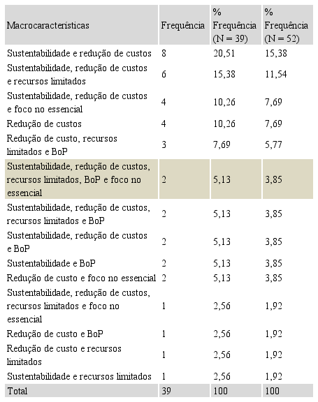 Na mesma linha, os resultados apontam que 39 empresas (76,47%) apresentaram pelo menos uma característica de inovação frugal (Tabela 2). Apenas duas empresas (3,85%), das 52 empresas premiadas apresentaram todas as macrocaracterísticas de inovação frugal, sendo Ambiente Verde, vencedora do prêmio de 2016/2017 e a Safety World, campeã da edição 2021/2022. Três empresas apresentam até 4 características; 15 empresas têm ao menos 3 categorias da inovação e outras 15 possuem 2 características essenciais da inovação frugal. Quatro empresas apresentam apenas a redução de custos como predisposição à inovação frugal.