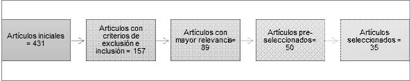En el proceso de selección de los artículos (Figura 1), se tuvo inicialmente 431 artículos, donde parte de la simplificación se consideró como uno de los criterios de inclusión como artículos científicos educativos publicados de los últimos 6 años, artículos de idioma en inglés, portugués y español; como criterio de exclusión se resaltan artículos duplicados, descarte tipo de formatos distintos y estudios sin relación al tema. Posterior a ello, se preseleccionaron 50 artículos y se seleccionaron dentro de ellos 35 con mayor énfasis y relevancia sobre la narración de cuentos como se visualiza en la Tabla 1, para proceder con el agrupamiento. Por último, para la agrupación se consideran el análisis de los títulos, resúmenes, discusión y conclusiones de los 35 artículos seleccionados, esto ayuda a generar las siguientes categorías: Narración de cuentos en el aprendizaje, en el desarrollo escolar, en la era digital y en la pedagogía.