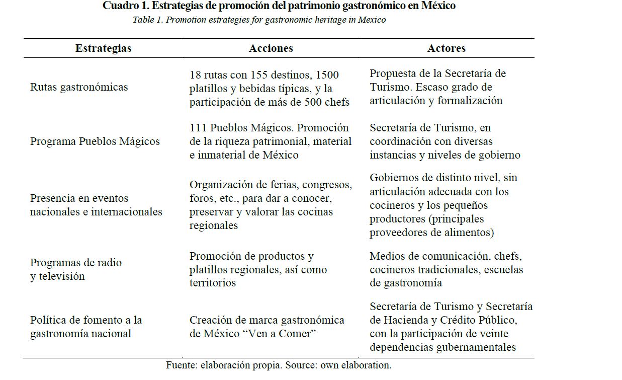 La política de fomento a la gastronomía mexicana es de creación reciente, aunque desde hace algunos años el gobierno mexicano, en distintos niveles, lleva a cabo diferentes estrategias para la promoción y difusión del patrimonio cultural de distintos territorios turísticos de México, entre los que se destacan también el patrimonio gastronómico (Cuadro 1).