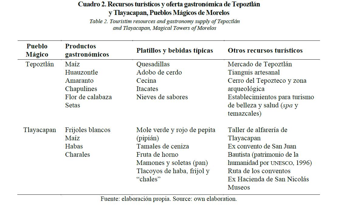 Resumen: Este trabajo analiza la potencialidad de dos Pueblos Mágicos mexicanos del estado de Morelos: Tepoztlán y Tlayacapan, para aprovechar su gastronomía e impulsar el turismo en la zona, y consecuentemente, el desarrollo local. La investigación se basó en revisión documental, observaciones directas y entrevistas a actores clave. Los Pueblos Mágicos analizados cuentan con infraestructura, recursos humanos y materias primas de calidad para consolidar su oferta gastronómica; sin embargo, este patrimonio gastronómico es poco evidente en la estrategia integral de turismo, por lo que no se constituye en un atractivo por sí mismo para los visitantes. La gastronomía no es considerada en general como una riqueza turística, sino como un servicio asociado al turismo. Se requieren alianzas entre los agentes públicos y privados para evitar la dispersión de los esfuerzos y poder crear una oferta gastronómica que fortalezca la competitividad turística de estos territorios.