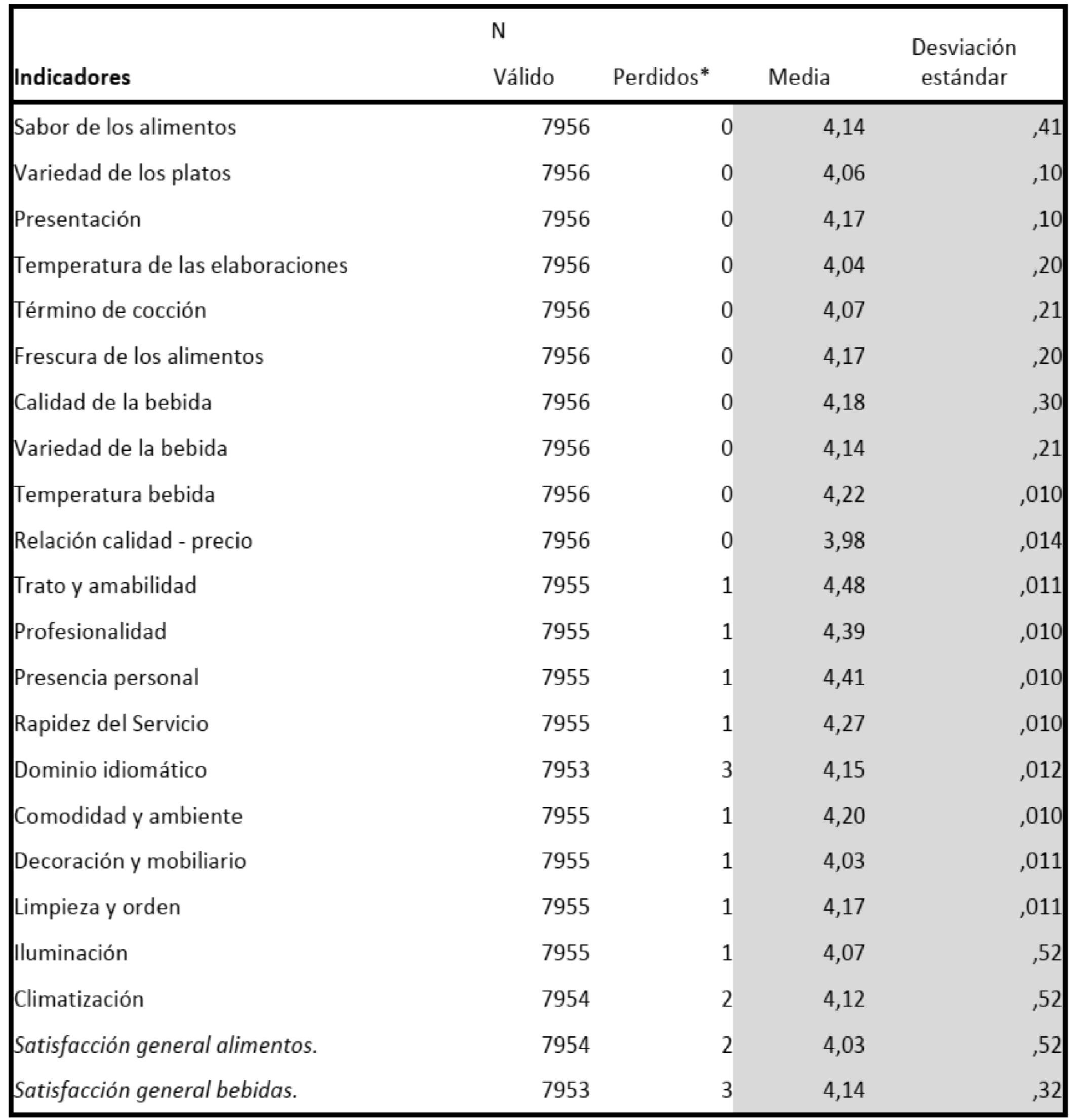 El indicador con valor más deteriorado fue la relación calidad - precio (3.98), por debajo del valor establecido para considerarse satisfactorio. La temperatura de las elaboraciones y la decoración y mobiliario [ambas con 4.03], si bien se encuentran por encima de 4 resultan ser valores muy cercano a este. En relación a las desviaciones estándar de las puntuaciones, estas tienen valores bajos lo que evidencia poca variabilidad en las respuestas de los clientes, demostrando homogeneidad en los criterios emitidos. Los datos obtenidos para la satisfacción general de alimentos y bebidas reflejan que la mejor valorada es la bebida (4.14) mientras que alimentos recibe una puntuación menor (4.03).