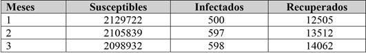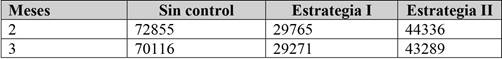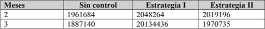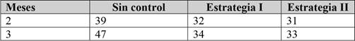 En las tablas 9, 10 y 11 se muestra la evolución de las cifras de susceptibles, infectados y muertos por la enfermedad en los meses 2 y 3 del estudio. Se puede verificar que los resultados de la estrategia I superan a los de la estrategia II, complementando los resultados obtenidos en las probabilidades directamente. Por tanto, el control es más efectivo al lograr mayor efectividad en el control de los contactos entre los mosquitos infectados y el ser humano y menor en la aplicación de tratamiento.