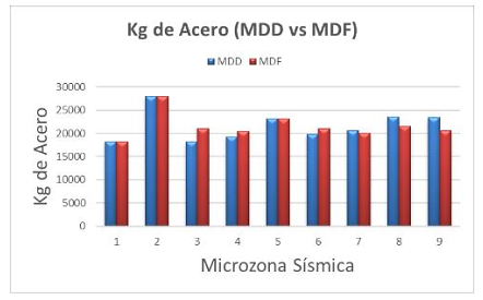 La Figura muestra de manera general que el diseño por el Método de las Fuerzas (MDF) presento mayor cantidad de kilogramos de acero para las microzonas 3, 4 y 6, y el diseño por el Método de los Desplazamientos (MDD) presento mayor cantidad en las microzonas 7, 8 y 9. Para la microzona 1 el diseño fue exigido por las dimensiones construibles mínimas para el sistema SMF con conexión BFP para ambos métodos por lo que las dimensiones finales fueron idénticas. Mientras que las microzonas sísmicas 2 y 5 exigió un dimensionado idéntico en ambos métodos para alejar el periodo fundamental de la estructura respecto al periodo característico del suelo.
