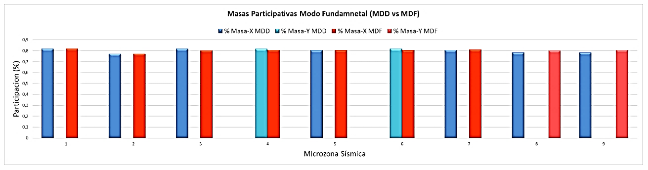 Como se observa las masas participativas de todas las edificaciones presento valores alrededor del 80% de participación para el periodo fundamental de la estructura, tanto en el MDD como el MDF. La Figura expone que los arquetipos en las microzonas 4 y 6 la dirección dominante para el MDD difiere de la dirección dominante para el MDF y de manera similar para las microzonas 8 y 9.