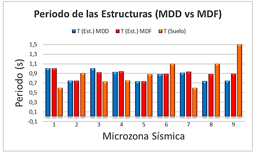 Específicamente para las microzonas con mayor diferencia, se puede notar que en la número 3 donde los periodos fundamentales de las estructuras fueron mayores al periodo del suelo, el MDD ofreció un valor mayor de periodo respecto al MDF, mientras que para las microzonas 8 y 9 donde los periodos fundamentales de las estructuras fueron menores al periodo del suelo, la situación se torna contraria.