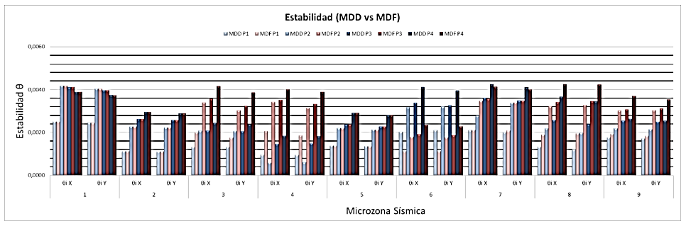 También se puede observar que las edificaciones para las microzonas 3, 4, 8 y 9 presentaron coeficientes de estabilidad mayores para el MDF que para el MDD, mientras que para la microzona 5 fue contrario y 7 fueron similares.