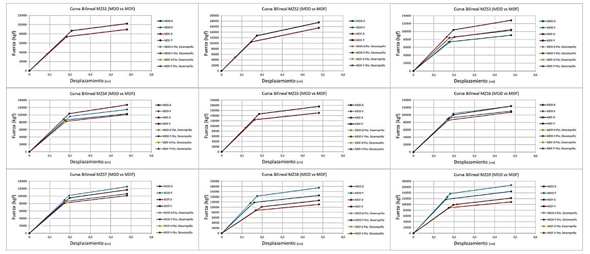 La Figura 14 muestra las curvas bilineales ofrecida por el software ETABS v20 [10] mediante el procedimiento ASCE 41-13 [11], el cual utiliza el método de los coeficientes para obtener los valores de la curva. Los valores de los cuales resultaron las gráficas, se encuentran comprendidos en el apartado de los anexos en la página 177 para los métodos MDF y MDD. En las figuras se observa que el comportamiento de las edificaciones diseñadas por el MDD y el (MDF en la microzona sísmica 1 fue idéntico. Así mismo ocurrió para las 2 y 5.
