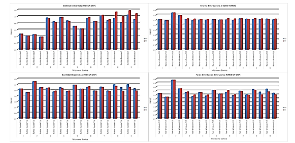 La Figura 15 expone los índices de la ductilidad demandada por el punto de desempeño, la ductilidad disponible después del punto de desempeño, la reserva de resistencia una vez alcanzada la cedencia del sistema estructural y el factor de reducción de respuesta resultante de los dos índices anteriores. La figura demuestra que la ductilidad demandada en las microzonas 3, 4 y 6 se obtuvieron valores cercanos a 1 con poca diferencia entre ambos métodos de diseño, lo que indica que la exigencia sísmica demando un comportamiento cercano a la cedencia del sistema con la aparición de algunas rotulas plásticas.