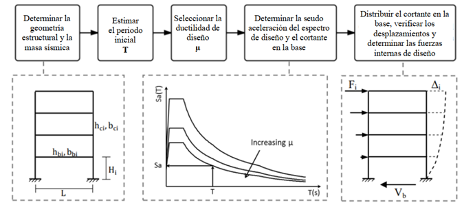 El proceso (FBD) comúnmente utiliza un espectro de diseño elástico reducido para obtener el cortante base sísmico. La secuencia de operaciones se resume en la Figura 1 y los pasos se describen con más detalle a continuación: