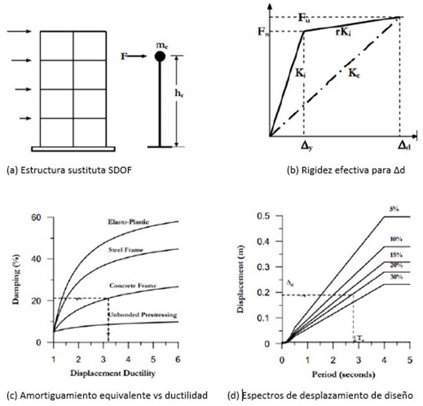 Al asumir un desplazamiento objetivo, basado en criterios de desempeño predefinidos, y una forma de desplazamiento lateral, el DDBD reemplaza el sistema de Múltiples Grados de Libertad (MDOF), de sus siglas en inglés, por un sistema equivalente de un solo grado de libertad (SDOF) en la Figura 2 (a), para los cuales es posible definir la masa efectiva (me), la altura efectiva (he) y el desplazamiento último objetivo (Δd).