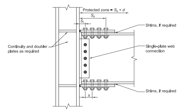 La conexión de tipo BFP (ver Figura 4) consiste en utilizar una plancha, que se soldada al ala de la columna, para apernar a ella el ala de la viga. Las planchas de las alas de la viga son soldadas a la columna con soldadura de penetración completa, luego la placa es apernada al ala de la viga. El alma de la viga es conectada al ala de la columna con una plancha de corte. Este tipo de conexión es válida para usarse en SMF.