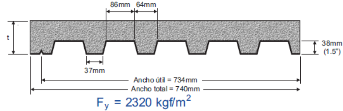 Para el cálculo de las cargas sobre las losas de entrepiso y techo se utilizó un sistema de encofrado metálico colaborante también llamado sofito metálico, a base de láminas de acero galvanizado corrugadas y tope de concreto. Se seleccionó un sistema de encofrado colaborante tipo Sigaldeck altura de 1.5” (38 mm) y calibre N° 22 del Catálogo de Productos de Maploca [6] (ver Figura 8).