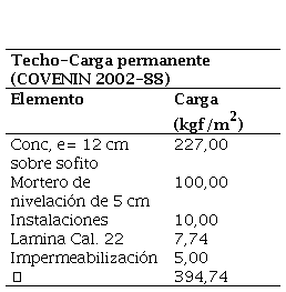 Las demás cargas consideradas como carga permanente (CP) son, el peso de del concreto sobre la lámina de acero la cual se obtiene de la ficha técnica ofrecida por Maploca, se hizo uso de un mortero de nivelación para dar pendiente y escurrir el agua producto de las precipitaciones con su respectiva impermeabilización en el techo, luego el peso de las instalaciones sanitarias y eléctricas, y finalmente para la losa de entrepiso se consideró aplicar el criterio de la Norma COVENIN 2002-88 [7] en su articulado 4.4 donde se usa una carga de 150 kgf/m2 para tabiquería que no tenga precisada su ubicación sobre la losa (ver Tablas 2 y 3).