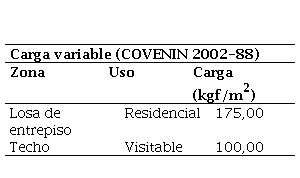 Para estimar las cargas variables sobre las losas de entrepiso y techo se optó por aplicar el criterio de la Norma COVENIN 2002-88 [7], la cual estipula que, para viviendas multifamiliares y ambientes de habitaciones, el valor es de 175 kgf/m2 como mínimo y la carga variable de techo se consideró como azotea visitable por lo tanto su carga es de 100 kgf/m2 (ver Tabla 4)