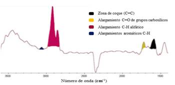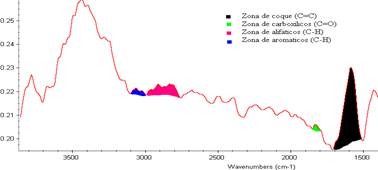 La cantidad de azufre inicialmente presente en la muestra de coque era de 5,49% y una vez aplicado el proceso de desulfurización se logró reducirlo a 2,28%. Luego se trató el coque de petróleo con Xileno mediante el método Soxhlet donde se extrajo el aceite contenido en él (19%). Posterior a los procesos descritos se observa en la espectroscopia obtenida (Figura 1) que en el intervalo entre 3300-3700 cm-1 corresponde a agua o grupos OH que no son representativos en el estudio realizado. Entre 3000-3100 cm-1 se percibe la presencia de una de zona aromáticos C-H; en el intervalo 2800-3000 cm-1 se muestra la presencia de zona de alifáticos C-H. En el intervalo 1680-1790 cm-1 marca la presencia de C=O de zona carboxílicos, casi despreciable compuesto básicamente por ésteres. El intervalo de 1500-1680 cm-1 representa la zona característica de enlaces C=C propios de coque.
