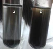 Una vez tratado el coque de petróleo con una amina cuaternaria se aplicó una prueba cualitativa de suspensión (Figura 3), comúnmente empleada en la industria petrolera para conocer qué tan organofílico es el lignito comercial con el aceite Vassa. Se observa en la Figura 3(a), que el coque sin tratamiento decanta en el aceite Vassa, mientras que para el mismo tiempo el coque de petróleo tratado (Figura 3(b)), se mantiene suspendido en el aceite, por lo que se puede inferir que el coque de petróleo se transformó en organofílico.