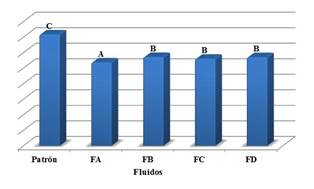 Aplicadas las ecuaciones respectivas se obtuvo una DMS = 0,343 para los fluidos y una DMS= 0,436 para las propiedades. En la Figura 4 se evidencia entonces que los fluidos FB, FC y FD presentan un comportamiento igual entre ellos, es decir las medias de sus propiedades se asemejan, pero difieren del fluido patrón (media por debajo) y a FA (media por encima), el cual también difiere del patrón. Este comportamiento corrobora la diferencia estadística obtenida en el estudio por parcelas divididas