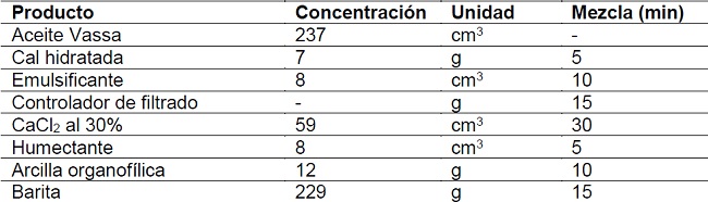 Posteriormente, el CPT se trabajó para hacerlo organofílico (Pinzón, 2006) iniciando de una dispersión de este en agua destilada, a la cual se le añadió una solución de amina cuaternaria (Dodigen 226) y se agitó durante 30 min. A continuación, a partir de una formulación para un fluido de perforación base aceite de densidad de 12 lpg (Samán Tecnología Integral en Petróleo, C.A ,2010) (Tabla 1) se propusieron 4 fluidos variando únicamente la concentración de coque de petróleo en 6, 8, 10 y 12 lb/bl (Tabla 2).