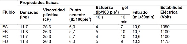 Formulados los fluidos de perforación y posterior a un proceso de envejecimiento dinámico con condiciones de temperatura de 300°F, presión de 100 lpcm y rotación de 100 rpm durante 16 horas que simularon las condiciones de pozos, se les midieron a los fluidos las propiedades físicas de estabilidad eléctrica, viscosidad plástica (VP), punto cedente (PC), esfuerzo gel (EG) y filtrado AT-AP (F) de acuerdo con la norma API RP 13B-2 (2003). Bajo las mismas condiciones se formuló y envejeció un fluido de perforación base aceite patrón (P) con controlador de filtrado comercial (lignito) de 8 lb/bbl, al cual también se le midieron las propiedades físicas mencionadas.