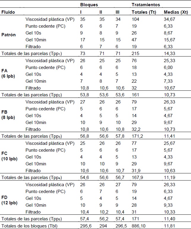 Finalmente, mediante el uso de un diseño factorial aleatorio, se aplicó un estudio estadístico de parcelas divididas de acuerdo con la metodología planteada por Little y Hills, (1998); la misma permitió comparar el efecto de la concentración de coque en los fluidos propuestos y el fluido patrón. También se aplicó el método de diferencias medias significativas (DMS) para establecer diferencias entre las distintas propiedades de los fluidos, para ello se utilizó una hoja de Excel.