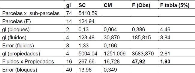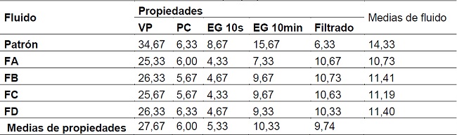 La diferencia estadística obtenida conllevó a un estudio de diferencias medias significativas (DMS) de los fluidos y de sus propiedades. En la Tabla 7 se muestran las medias de los fluidos y de las propiedades para su comparación.