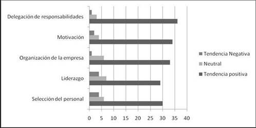 Sobre la organización de la empresa, (tendencia predominante positiva), los estudiantes se encuentran en disposición de cooperar en los procesos y sistemas organizacionales, además de organizar los procesos de trabajo. Martínez y Carmona (2009) señalan que ello les permite planificar y coordinar a un conjunto de personas de forma eficaz, para realizar acciones sistemáticas en pro de los objetivos deseados y minimizando los costos.